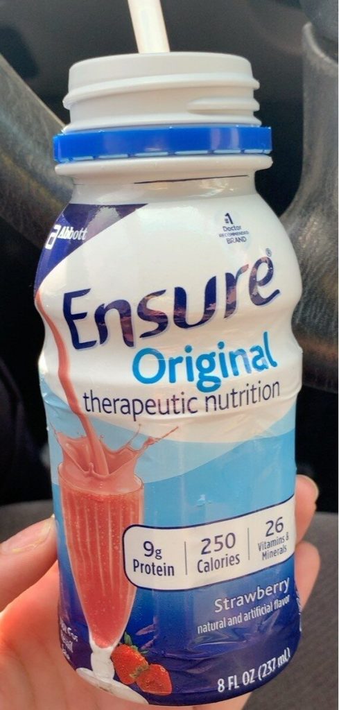 I imagine that drink to be Ensure or Ovaltine, possibly Caffeine Free Coke Zero if things get nuts.