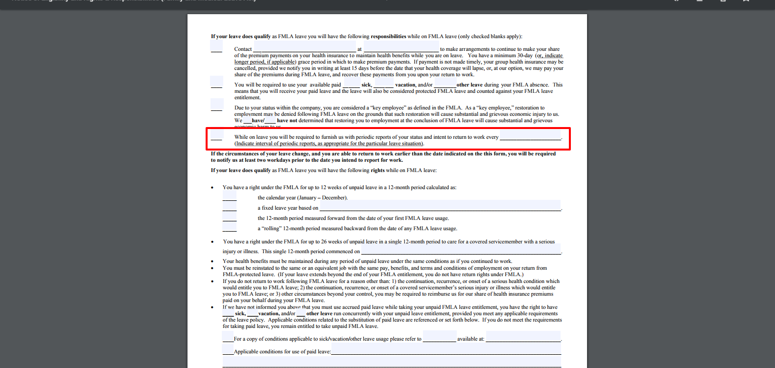 For example, on the Notice of Eligibility and Rights & Responsibilities, defendant’s Human Resources personnel did not complete this section. Therefore, the plaintiff had no idea when she had to furnish the defendant with periodic reports of her status and intent to return to work. Plus, on the Designation Notice defendant provided to the plaintiff, it reads, “The FMLA requires that you notify us as soon as practicable if dates of scheduled leave change or are extended, or were initially unknown.” Finally, the defendant’s policy manual reads, “If the employee’s anticipated return to work date changes and it becomes necessary for the employee to take more or less leave than originally anticipated, the employee must provide the County with reasonable advance notice (i.e., within 4 business days) of the employee’s changed circumstances and new return to work date.”