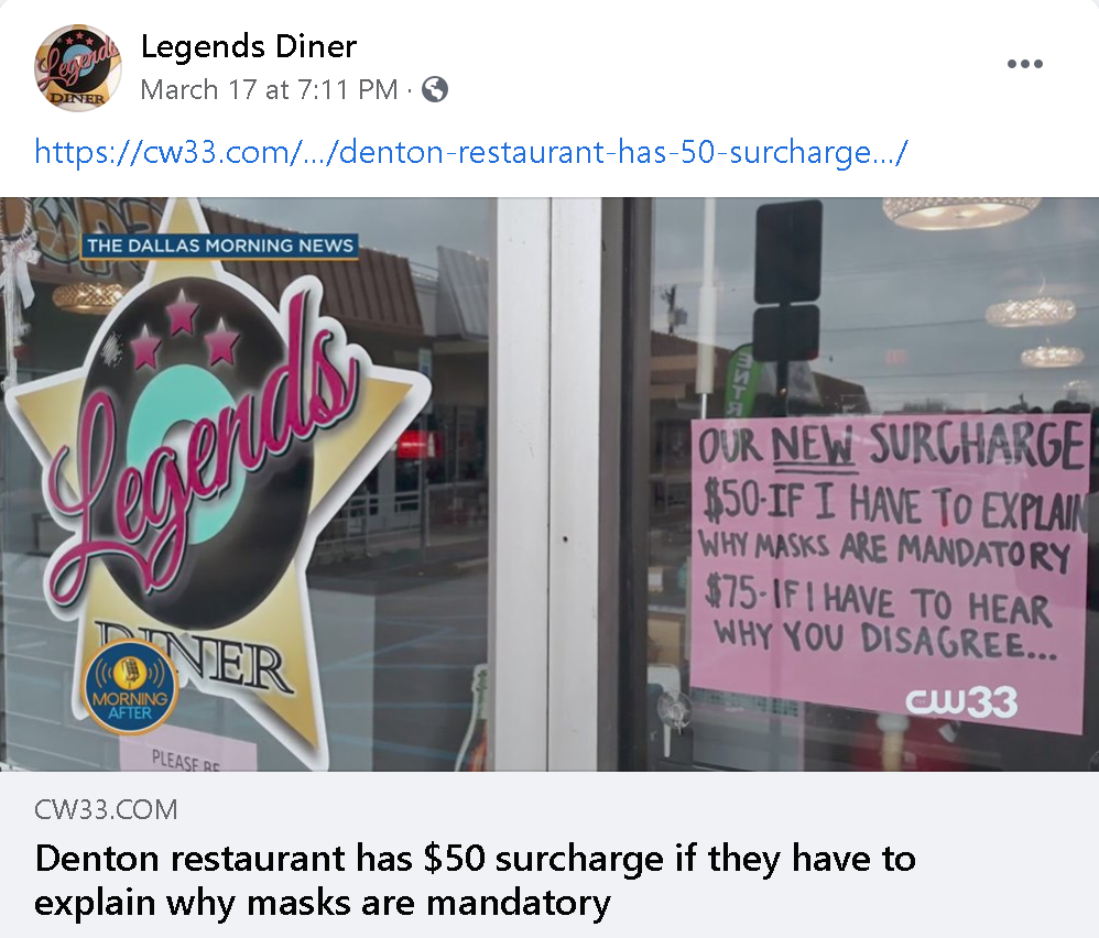 CW33 in reports here that a Denton diner “rolled out a $50 surcharge if they have to explain why masks are mandatory in the restaurant and $75 if they have to listen to you disagree.”
