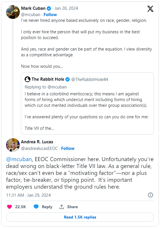 Earlier, Mr. Cuban tweeted a link to a YouTube video of an October 2023 event The Federalist Society hosted featuring Commissioner Lucas and EEOC Vice Chair Jocelyn Samuel, in which they discussed the benefits and risks related to various categories of DEI programs, how employers should assess the lawfulness of their initiatives and promising practices and guardrails for employers. Both agreed that employers cannot set quotas (e.g., we must hire “x” number of black men or promote “y” number of white women) and act on them.