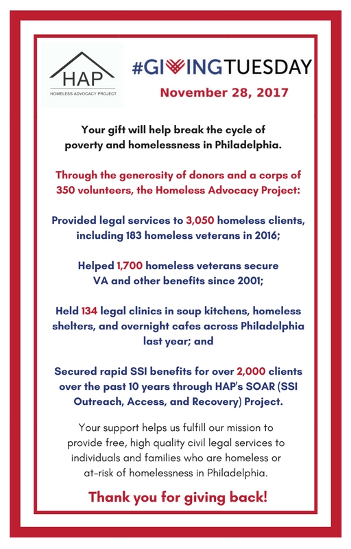 On this Belated #GivingTuesday (a/k/a Wednesday), please consider supporting the Homeless Advocacy Project