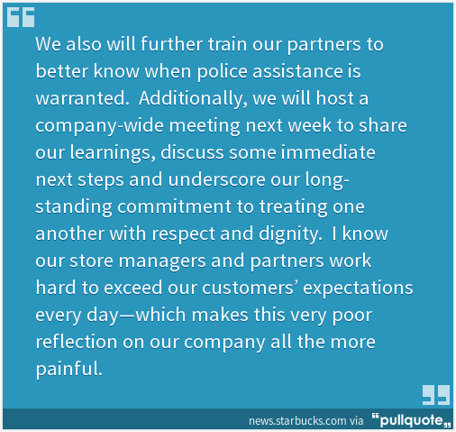 All told, Starbucks and Mr. Johnson checked three important boxes. First, Mr. Johnson apologized. He apologized a lot — to the two men arrested, to the City of Philadelphia, and to the customers of Starbucks. (Multiple reports indicate that the two men will meet with Mr. Johnson to address the incident.) Second, Mr. Johnson didn’t sugarcoat what happened. He called out Thursday’s event as an example of unconscious bias — racism. Third, Mr. Johnson/Starbucks promised that the company would learn from this incident, take specific action, and improve, including a mandate that store managers would undergo specific training for how to spot “unconscious bias.”