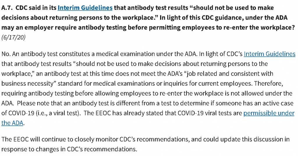 So, then, should you require employees to get tested for COVID-19 antibodies as a condition of returning to work?