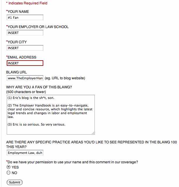 …Unless every one of my readers nominates me for the ABA Journal’s Blawg 100 Amici (a/k/a the 100 best damn law blogs on the interwebs). The nomination deadline is September 9.