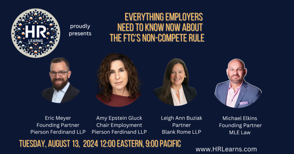 The FTC’s Rule banning non-competes takes effect on September 4, 2024. Before then, employers must notify most employees that their noncompetition agreements are unenforceable. However, several pending lawsuits aim to block the Rule. Although, none have succeeded…yet. What does the Rule require? What are the chances that these lawsuits will succeed? And what should businesses do between now and September besides clutch their pearls? We’ve assembled an all-star panel of employment lawyers to answer these questions and help your business prepare.