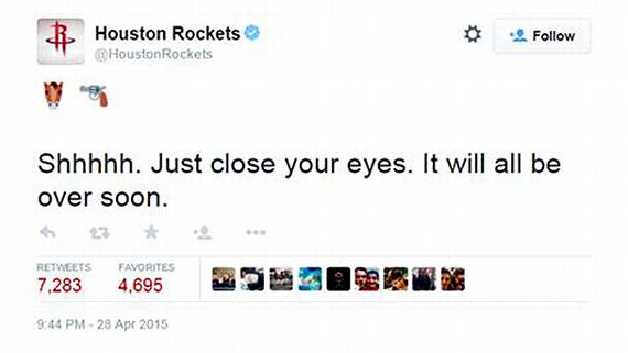 Then, with the Rockets closing in a victory, YIKES! A tweet with an emoji gun pointed at an emoji horse head, and the message: “Shhhhh. Just close your eyes. It will all be over soon.”