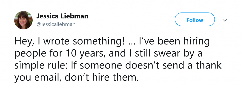 Here’s my take: I like ‘thank you’ notes. A well-written thank you from a candidate is a check in the ‘hire me’ column. That’s especially true if the candidate can use the note to connect a conversation from the interview to emphasize his or her fit for the position. That’s an effective tool. But, no ‘thank you’ note isn’t a dealbreaker. If you’re the best candidate for the job, you’re getting the job either way.
