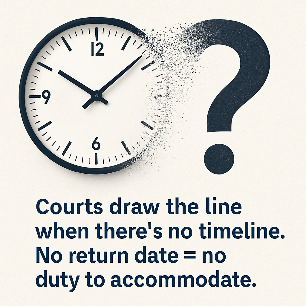 Extended leave can be a reasonable accommodation—but not always. This case shows how courts draw the line: when an employee cannot offer a projected return date and is medically unable to work in any capacity, the duty to accommodate ends.