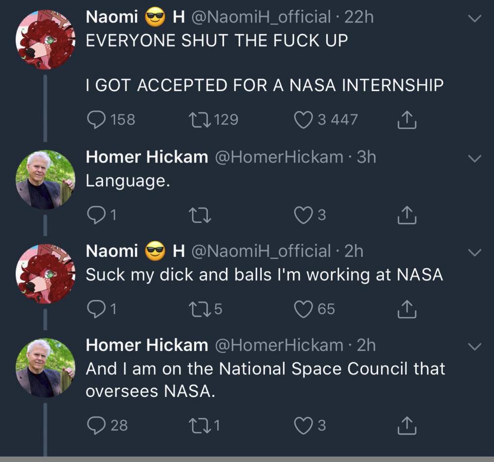 Mr. Hickam also acknowledged that @NaomiH_official contacted him to apologize, and he accepted. He also believes that, based on @NaomiH_official’s credentials, @NaomiH_official deserves a position in the aerospace industry and he’s trying to secure @NaomiH_official and better internship than the one that @NaomiH_official lost.